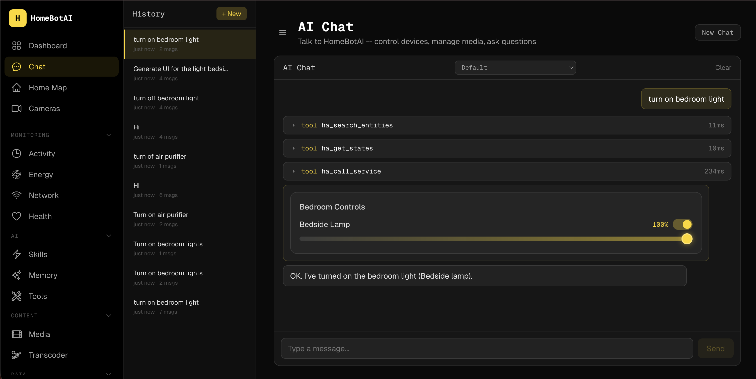 Direct lights, climate, and entities through conversation with tool-call transparency so you can see what ran, when, and why. The model stays grounded in live Home Assistant state instead of guessing from memory alone.