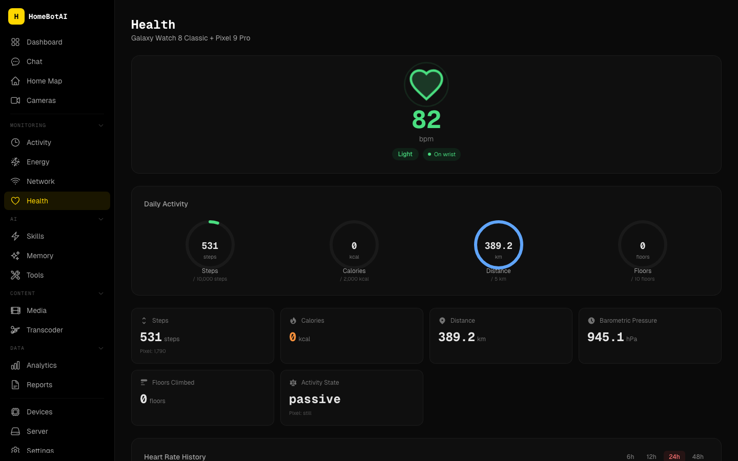 Bring wearable summaries, activity rings, and heart-rate trends alongside home context for a single glance at how you and your environment are doing. Ideal for dashboards that mix personal and household telemetry.