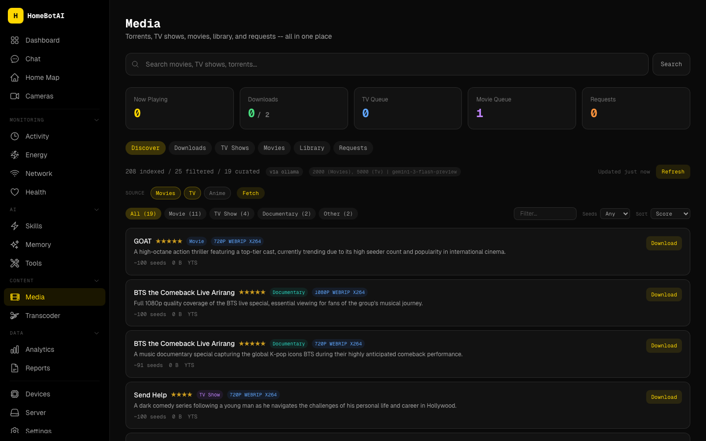 Track and drive a unified pipeline across Sonarr, Radarr, Jellyfin, Transmission, Jellyseerr, and Prowlarr from one operational picture. Queue health, grab status, and playback context land in the same UI you use for the rest of your home.
