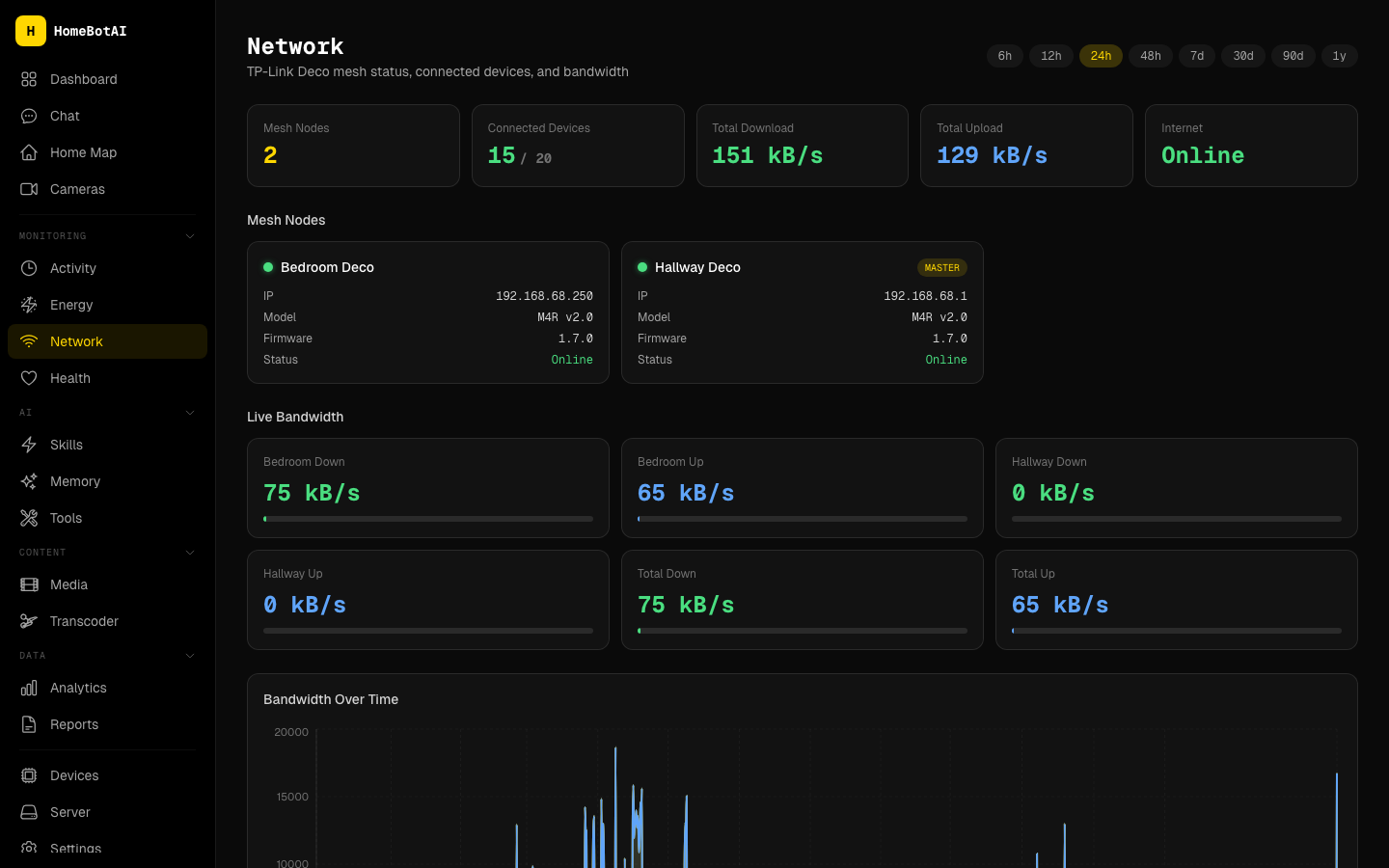 Visualize mesh nodes, connected clients, and bandwidth so you can spot congestion, rogue devices, or offline access points quickly. It complements Home Assistant with a networking lens purpose-built for home operators.