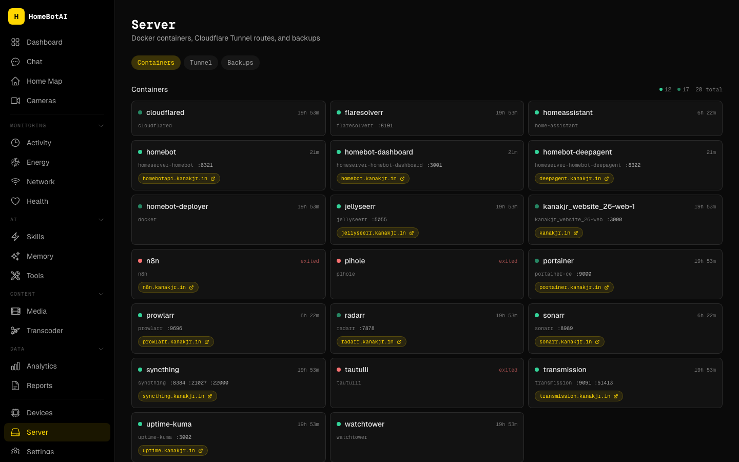 Inspect Docker containers, Cloudflare tunnels, and backup posture without SSHing host-by-host. The goal is operational confidence: what is running, how it is exposed, and whether recovery paths look sane.
