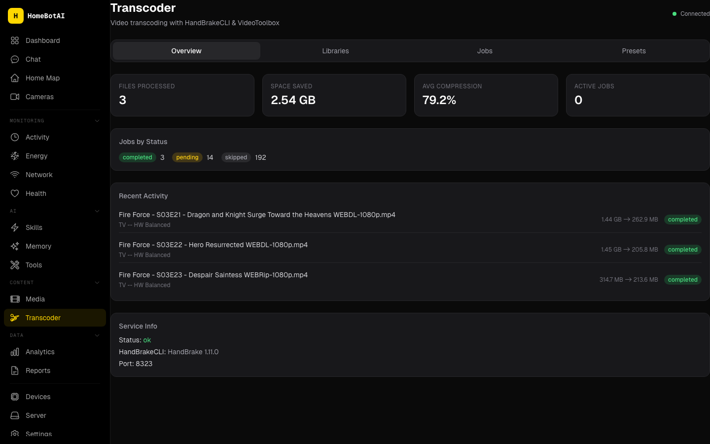 Queue HandBrake-driven transcoding jobs against your media library with progress surfaced in the same console as acquisition and playback. Normalize formats for clients that dislike certain codecs or bitrates.
