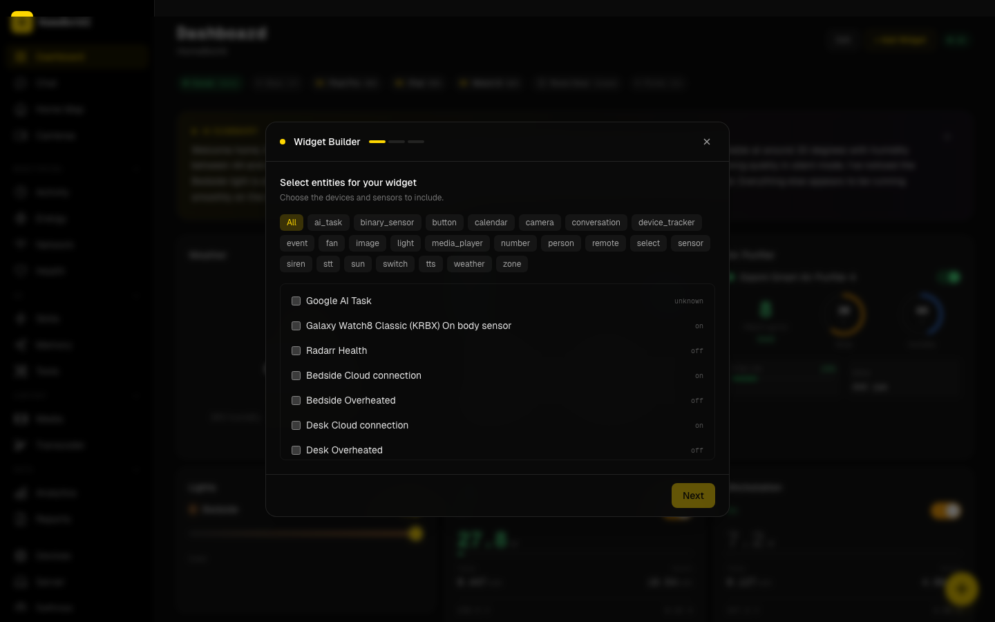 Select entities and let the assistant generate dashboard widgets using generative UI patterns that match your data types. You iterate in plain language instead of hand-authoring component props for every new sensor.